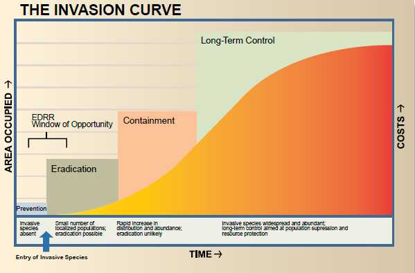On February 18, 2016, the U.S. Department of the Interior released an interdepartmental frameowrk for the early detection and rapid response (EDRR) of invasive species--a coordinated set of actions to find and eradicate potential invasive species before they spread and cause harm..  The bedrock of the report is that the earlier you see the invasive and the quicker you respond then better the chances of eliminating the invasive species.