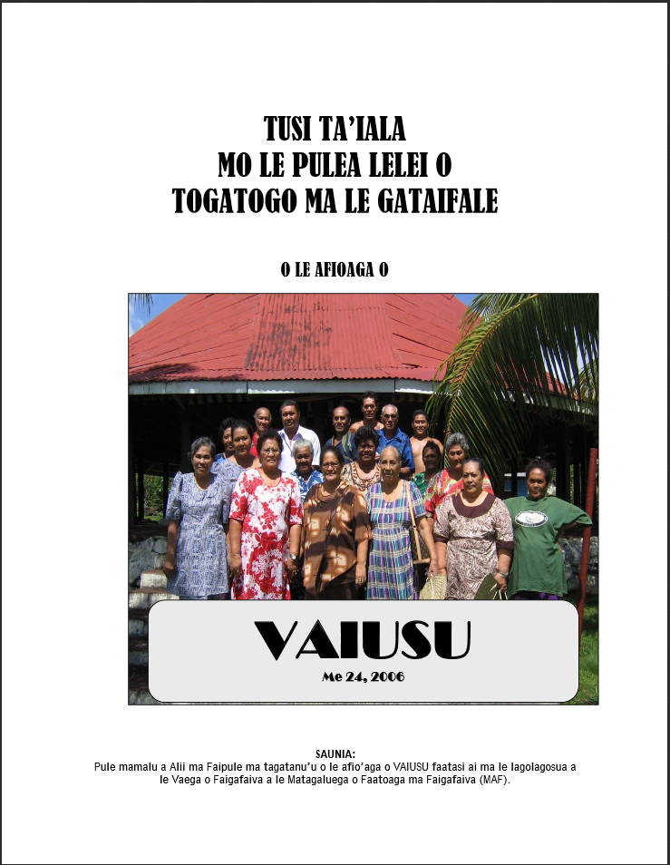 O lenei fuafuaga o mo le Pulea Lelei o Togatogo ma le Gataifale o Vaiusu Faleata ua saunia e Alii ma Faipule faatasi ai ma le Faufautua a le Komiti o Faletua ma Tausi. O loo faatasi ai foi ma le lagolagosua a le Vaega o Faigafaiva o le Matagaluega o Fa’atoaga ma Faigafaiva (MAF).