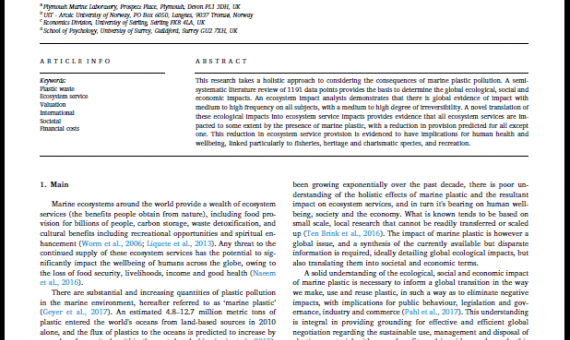 This research takes a holistic approach to considering the consequences of marine plastic pollution. A semi-systematic iterature review of 1191 data points provides the basis to determine the global ecological, social and economic impacts.