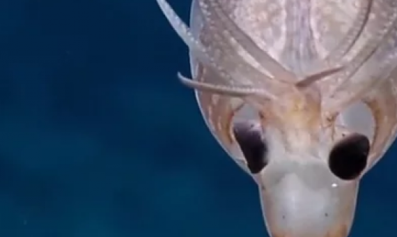 The team aboard the Exploration Vessel Nautilus team used a camera to enjoy a close-up with a see-through piglet squid (Helicocranchia sp.), named for its large siphon that looks like a snout. Click on the link below to read the full article.