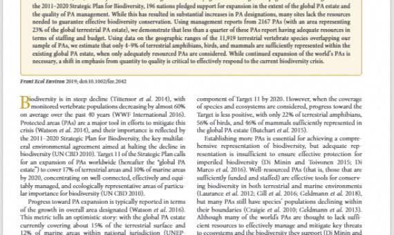 Using management reports from 2167 PAs (with an area representing 23% of the global terrestrial PA estate), we demonstrate that less than a quarter of these PAs report having adequate resources in terms of staffing and budget. Click on the link below to access the full paper.