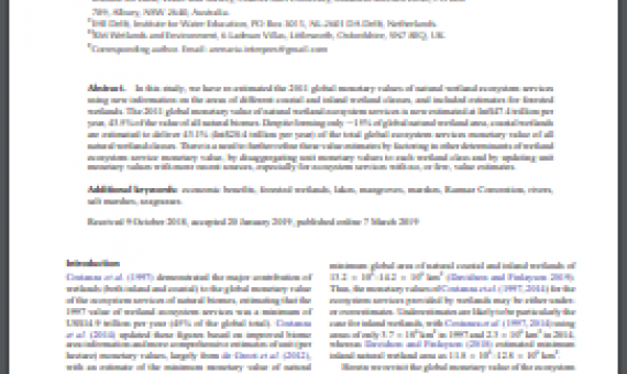 In this study, we have re-estimated the 2011 global monetary values of natural wetland ecosystem services using new information on the areas of different coastal and inland wetland classes, and included estimates for forested wetlands. Click on the link below to access the full article